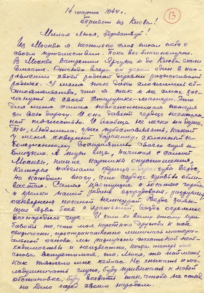 Из Москвы я несколько слов писал тебе о своем путешествии. Пока все благополучно. В Москве встретил Ярчука и до Киева ехали вместе. Отсюда вчера он уехал один в направлении своей родной деревни разыскивать родных. У меня так дико сложились обстоятельства, что я так и не смог заглянуть к своей старушке-матери. Это для меня самая невосполнимая потеря за всю дорогу. И она давит сердце несказанной тяжестью. И вообще не легко на душе. Ты, Людмила, уже представляешь, какой у меня скверный характер, склонный к болезненному восприятию своего горя и близких. А тут еще, начиная с самой Москвы, такие картины опустошения, которые наделали фрицы-душегубы везде, на каждом шагу, что сердце кровью обливается. Самые цветущие и богатые города и уголки нашей Родины изуродованы, разрушены, осквернены поганой немчурой. Везде зияющие язвы боев и сражений, везде огромное всенародное горе. И если ко всему этому прибавить то, что моя короткая дружба к тебе физически, пространственно лишилась материальной основы, мы разлучены жестокой необходимостью и неизвестно, когда теперь мы снова встретимся, то, Люся, ты поймешь, как тяжело мне сейчас. Но хныкать и малодушничать глупо, буду привыкать к новой обстановке, буду воевать так, чтобы не стыдно было перед своим народом.