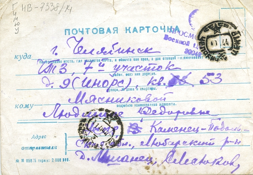 Я тебе писал дорогой из разных мест. Из Киева я выехал через Коростень, Новгород-Волынский, Шепетовку в Славутич, где встретил Владимира и заехали к его родным, откуда и пишу эту открытку. Пока будем служить в Житомире. Из Житомира подробно напишу обо всем. Грущу и тоскую по тебе, хотя ты, быть может, воспринимаешь все это своеобразно. Хотелось бы, чтобы ты написала это же самое ко мне. Ты, Люся только не сердись, так как в твои лета устойчивость относительна. Пока жизнь идет отлично; вчера, сегодня и завтра пьем горилку. Желаю всем здоровья и счастья. Привет от Владимира; он говорит, что скоро приедет в Челябинск. Целую – Стива.