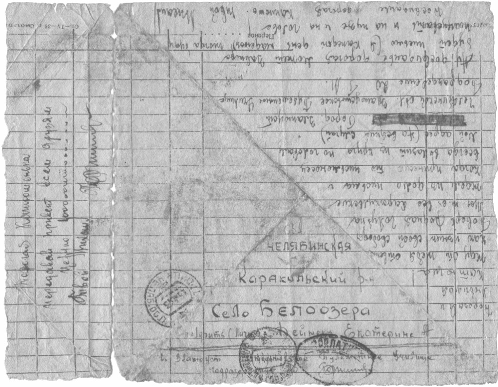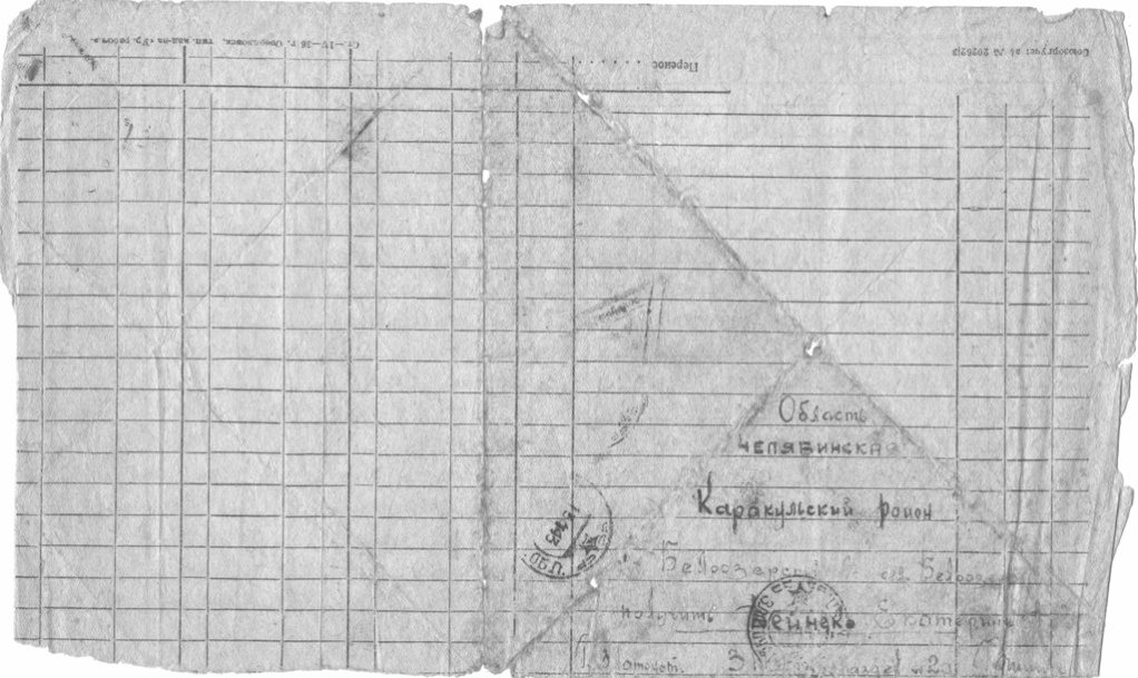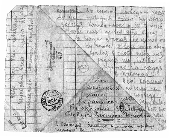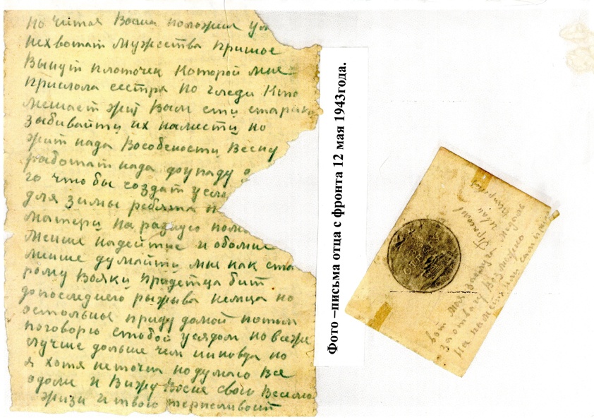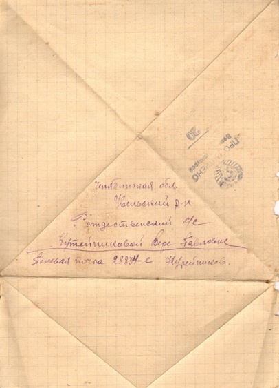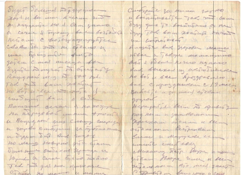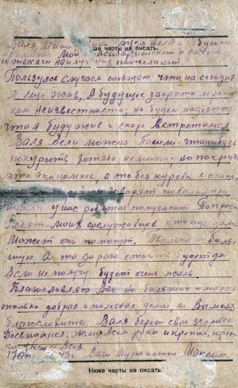 Но читая Ваши положим у(ма) нехватат мужества притое вынут плоточек которой мне прислала сестра по гледи Кто Мешает жит вам ети старика забивайти их намести пожит нада Вособености Весну работат нада доупаду (…) что бы создат усло(вия) (…) для зимы ребята (…) матери на разную пом(ощь на ) меня надейтис и обомне меньше думайти Мне как старому вояки придетца бит до последнего рыжева немца но остольное приду домой потом поговорю с тобой усядем но всеже лучше дольше чем никовда но я хотя неточно но думаю все одоме и вижу восне свою веселою жизнь и твою терпеливост