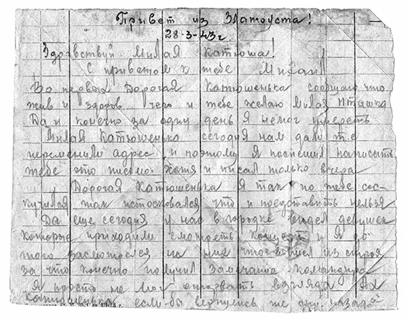 Здравствуй Милая Катюша! С приветом к тебе Михаил Во первых Дорогая Катюшенька сообщаю что жив и здоров чего и тебе желаю милая пташка. Да и конечно за один день я не мог умереть Милая Катюшенька сегодня нам дали т.е. переменили адрес и поэтому я поспешил написать тебе это письмо. Хотя и писал только вчера. Дорогая Катюшенька я так по тебе соскучился так истоскавался что и представить нельзя Да еще сегодня у нас в городке видел девушек которые приходили смотреть концерт и я до того засмотрелся на них что вышел из строя за что конечно получил замечание командира я просто не мог оторвать взгляда Ах Катюшенька если бы вернулись те дни назад (…)…