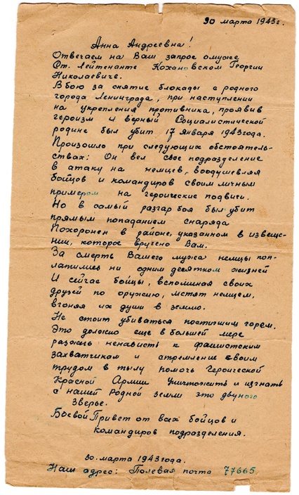 Не стоит убиваться постигшим горем. Это должно еще в большей мере разжечь ненависть к фашистским захватчикам и стремление своим трудом в тылу помочь Героической Красной Армии Уничтожить и изгнать с нашей Родной земли это двуного зверье.