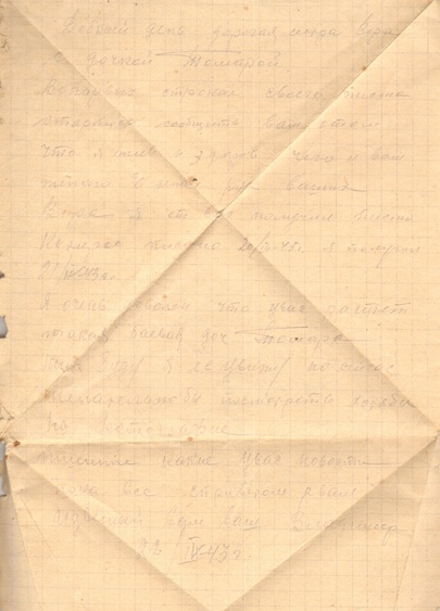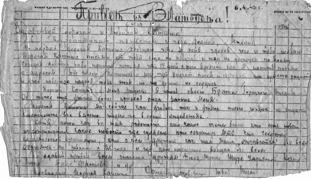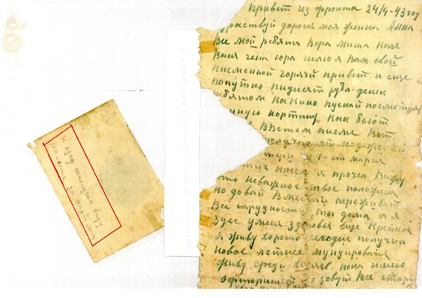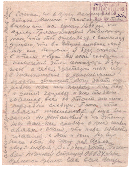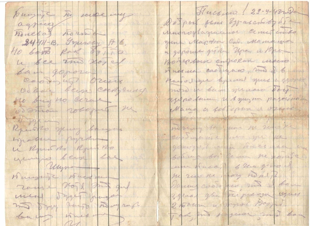 Добрый день здравствуйте многоуважаемое семейство жена Марфа Ст. Мамаша и дорогие детки Ира и Юра. Вопервых строках моего письма сообщаю, что в настоящее время жив и здоров чего и вам желаю быть здоровыми и в жизни радостными Маша и вовторых я очень на вас обижен почему вы мне ни чего не сообщаете или же не доходят письма или вообще вы сами не хотите мне писать в чём дело я ни чего не могу понять. Дальше сообщаю, что я вам сделал два перевода один 2 тысячи и другой 1900 руб. Так, что надеюсь, что вам будет большая поддержка хотя и вы мне писали что не нуждаетесь но я сам знаю и сейчас я прошу вас во что бы то не стало сфотографируйтесь сколько бы это не стоило и мне пришлите фото затем с мая месяца вы будете получат по аттестату. Каждый м-ц по 800 руб. Так что вам хватит. Но вот и всё что хотел я сообщить вам о себе. Конечно сейчас я нахожусь на передовой линии фронта и каждый день слышу снаряды и зорко смотрим за противником и будем бить как гадов но Маша наверно дети стали большие особенно Ирина и Юрик а сечас стало тепло так что для них приволье стало но маша и мама смотрите за ними зорко и воспитывайте так что сам буду жив то воспитаю а не буду так вам хватить на что их воспитыват пишите как здоровье маша твоё и также мамашино вот я об вас нечего незнаю как выехал из актюбинска Но вот и всё поздравляю вас с праздником с 1м маем. Выпейте и за меня стакан другой. Передайте всем по привету родным и знакомым кресным обоим и всем остальным сестрёнкам Елене и Маруське если имеете с ней связь Михаилу Петр. Шуре и их Деткам Нюре Илье и всем остальным кто меня знает. С приветом ваш муж и сын. Пишите по моему адресу.