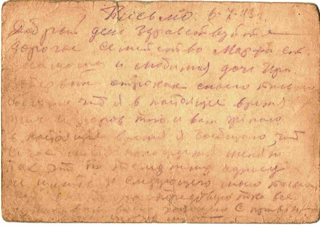 Вопервых строках моего письма сообщаю, что в настоящее время жив и здоров того и вам желаю быт в жизни радостными в настоящее время нахожусь все еще в тылу но наверное скоро придется опять ехать на передовую бить в рага в упор но вот и все что хотел сообщит. Передайте привет всем родным и знакомым Михаилу Пет. … Нюре и хресным и всем остальным