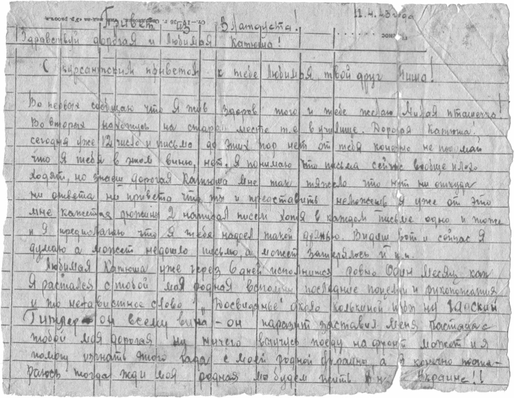 Любимая Катюша уже через 6 дней исполнится ровно один месяц как Я растался с тобой моя родная вспомни последние поцелуи и рукопожатия и то ненавистное слово «Досвиданье» около колькиной избы ну гадский Гитлер (…) он всему вина – он паразит заставил меня растаца с тобой моя дорогая ну ничего выучусь поеду на фронт может и я помогу изгнать этого гада с моей родной украины, а я конечно постараюсь тогда жди меня моя родная мы будем жить в н(…) Украине!!