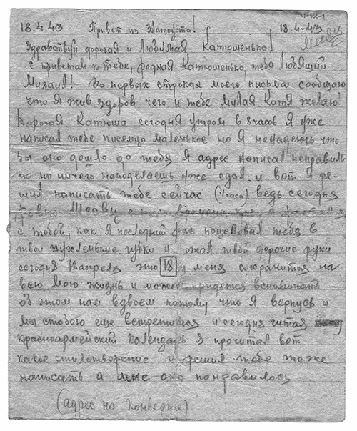 С приветом к тебе, родная Катюшенька, тебя любящий Михаил! Во первых строках моего письма сообщаю что я жив здоров чего и тебе милая Катя желаю! Дорогая Катюша сегодня утром в 8 часов я уже написал тебе писемцо маленькое но я не надеюсь чтобы оно дошло до тебя я адрес написал неправильно но ничего не поделаешь уже сдал. И вот я решил написать тебе сейчас (4 часа) ведь сегодня ровно месяц с того времени как я расстался с тобой, как я последний раз поцеловал тебя в твои пухленькие губки и пожал твои дорогие руки сегодня 18 апреля это 18 у меня сохранится на всю мою жизнь и может придется вспоминать об этом нам вдвоем потому что я вернусь и мы с тобою вместе еще встретимся и сегодня читая красноармейский календарь я прочитал вот какое стихотворение и решил тебе тоже написать а мне оно понравилось