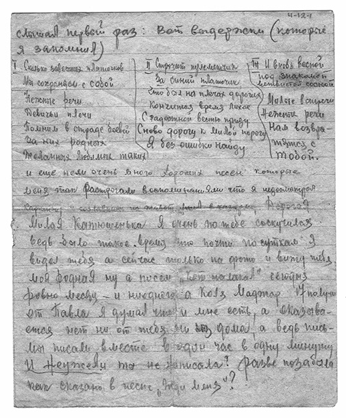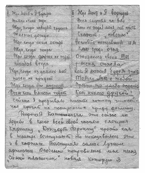 Дорогая Катюшенька это сейчас мы ходили в кино всей своей частью смотрел картину «Концерт фронту» просто как в театре выступают то показывалась это и в картине Выступали самые лучшие артисты особенно понравилась мне песня «Синий платочик» новая которую я слышал первый раз: Вот выдержки (которые я запомнил).