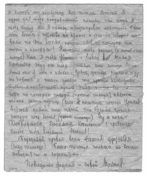 А может ты не получаеш мои письма может я адрес дал тебе неправильный потому что когда я тебе пишу то я не могу хладнокровно изложить всю мою мысль и чувства на бумаге и если бы говорил словам то это был бы поиск слов на которых ты ничего и непоняла? Непонять тебе родная (а может и понимаешь) как я тебя уважаю и люблю. Милая Катенька Жду от тебя письма как птица хотя оно у нас и плохое – грязь, дождь туман и др. но бывают и жаркие деньки что просто благодать. Только и нехватает одной тебя и то все горы по которым ползут (просто ползут) облака зелень речки горные (ведь я нахожусь посредь Урала) вобщем домой так тянет что были бы крылья каждую ночь летал (днем некогда) Ну а пока Досвиданье любимая Катюша с приветом ктебе тебя любящий Михаил!
