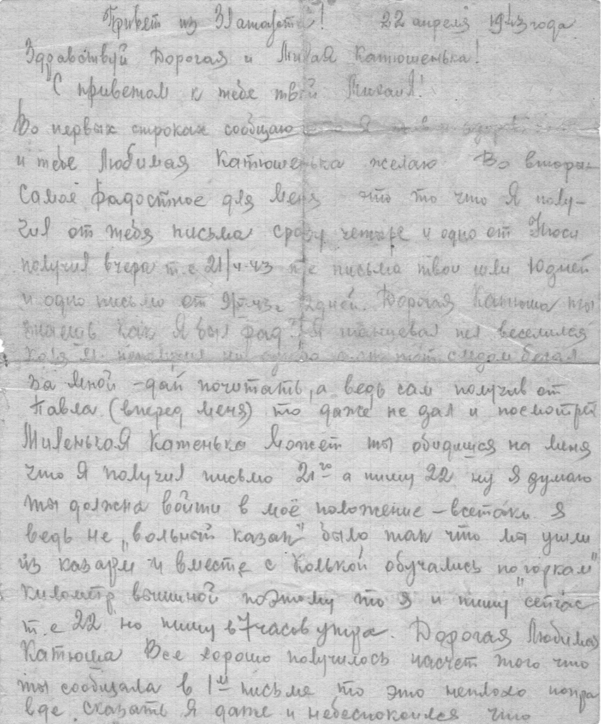 Во первых, дорогая Катюша, сообщаю что Я жив здоров чего и тебе желаю. Дорогая Катюша письмо от тебя еще не получил и жду не дождусь по моему сегодня должно было прийти потому что 14 дней с того времени как я написал письмо с адресом Ты знаеш Катюшенька как тут насчет писем – придет так просто радость. Я уже наверно надоел тебе этим но ты дорогая не сердись.