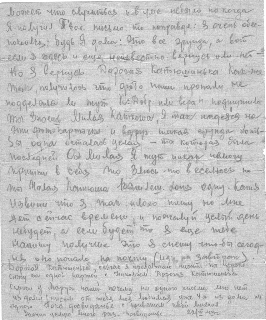 Во первых строках сообщаю что я жив и здоров и тебе Любимая Катюшенька желаю Во вторых самое радостное для меня это то что я получил от тебя письма сразу четыре и одно от Нюси получил вчера т.е. 21/4-43 те письма твои шли 10 дней и одно письмо от 9/4-43 г. 2 дней. Дорогая Катюша ты знаешь как Я был рад? Я танцевал пел веселился. Коля М неполучил ни одного так тот следом бегал за мной – дай почитать, а ведь сам получив от Павла (вперед меня) то даже не дал посмотреть. Миленькая Катенька может ты обидишься на меня что я получил письмо 21го а пишу 22 ну я думаю ты должна войти в мое положение – всетаки я ведь не «вольный казак» было так что мы ушли из казарм вместе с Колькой и обучались по «горкам» километр вышиной поэтому то я и пишу сейчас т.е. 22 но пишу в 7 утра. Дорогая Любимая Катюша Все хорошо получилось насчет того что ты сообщала в 1м письме то это неплохо поправде сказать Я даже не беспокоился что может что случиться и в уме небыло но когда я получил Т,вое письмо то поправде: Это все эрунда, а вот если я здесь и еще не известно – вернусь или нет – но я вернусь Дорогая Катюшенька. Как же так, получилось что фото наши пропали не подделала ли тут К. Добр. или вера Н. подшутила.Ты знаешь Милая Катюша, я так надеялся на эти фотокарточки и вдруг такая ерунда хотьбы одна осталась целая – та которая была последней Ох Милая Я тут никак немогу притти в себя то злюсь – то веселюсь но ты Милая Катюша вышлеш хоть одну. Катя извини что я так плохо пишу но мне нет сейчас времени, и пожалуй целый день небудет, а если будет то я еще тебе напишу получше Это я спешу что-бы сегодня оно попало на почту («иду» на завтрак). Дорогая Катюшенька, сейчас я продолжаю писать на уроке. Сижу за одной партой с Николаем. Дорогая Катюшенька спроси у Маруси нашей почему ни одного письма мне нет из дому писем от тебя моя любимая уже 4 а из дома н одного. Пока досвиданье с приветом твой Михаил.