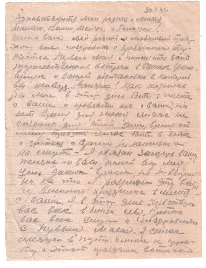 Шлю вам мой родной и любимый привет. Хочу вас поздравить с праздником торжества Первого мая. Пожелать вам торжественной встречи в ваших условиях и вашей обстановки в которой вы живете, Манчек! Как хотелось бы мне в этот день быть в месте с вами и провести его с вами. Но нет время для меня сейчас не создано для этой цели, время от меня требует сейчас быть в боях и драться с Армией не нажизнь а на смерть – я обязан защитить вашу жизнь и ваш покой вот моя цель данного времени, но не взирая ни на что я разделяю эту встречу великого праздника вместе с вами, я в этот день чувствуя вас всех вблизи себя. Крепко вас всех целую и поздравляю с Первомаем. Маша, я сейчас следую в пути ближе к фронту и этот праздник встречаю в вагоне, но в кругу командиров и бойцов. Манечек – аттестат я тебе высылал на 1200 руб. по адресу Грязнухинский райвоенкомат. Так что ты справляйся в военкомат. Думаю, что во второй половине мая ты его получишь. Я буду спокоен? в этом когда ты мне сообщишь об полученной этого аттестата. Пару слов о себе; чувствую пока себя в благополучии о дальнейшем судьба скажет. Хочу знать подробно как ты живешь – как твое и детей здоровье и чем ты занимаешся, все об этом ты мне подробно сообщи. Пока, что связей письменных я еще нискем не установил а по этому ты так-же сообщи с кем имеешь связи и о ком, что тебе извесно главное о Ани и Юли. Ну вот пока и все на этот раз. Адрес мой новый; Воинская часть, Полевая почтовая станция 06034. Мне.