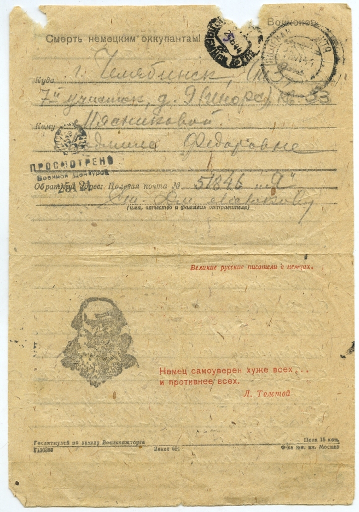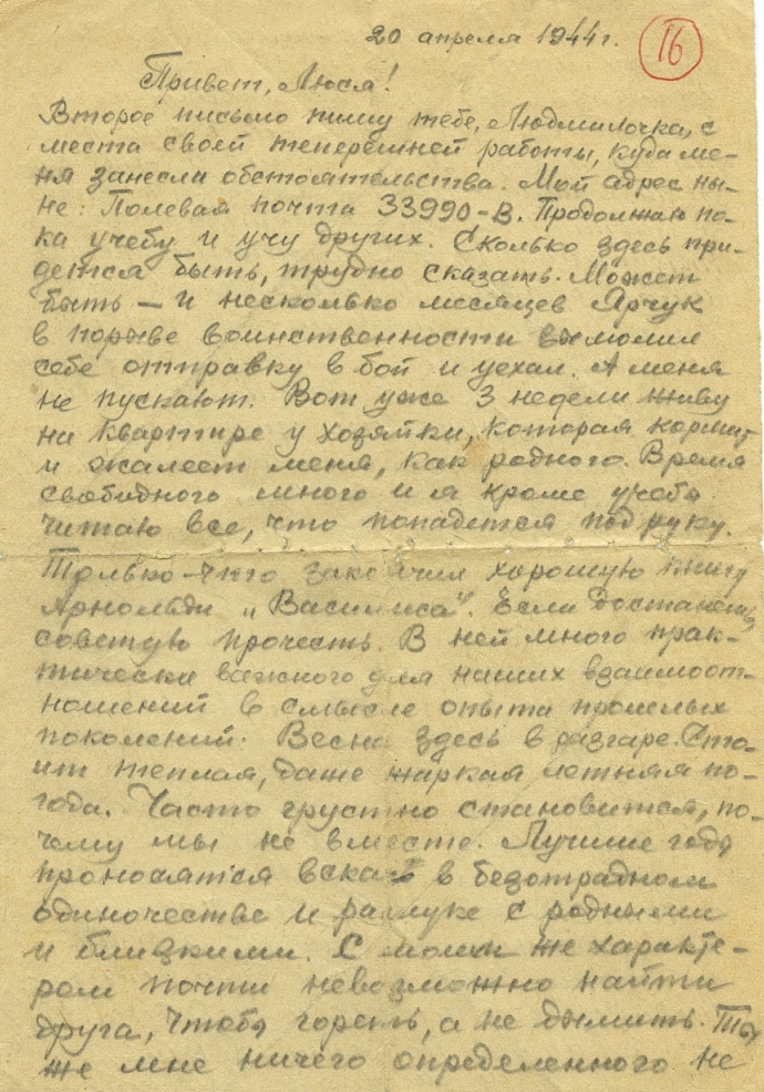 Второе письмо пишу тебе, Людмилочка, с места своей теперешней работы, куда меня занесли обстоятельства. Мой адрес нынче: Полевая почта 33990-В. Продолжаю пока учебу и учу других. Сколько здесь придется быть, трудно сказать. Может быть – несколько месяцев. Ярчук в порыве воинственности вымолил себе отправку в бой и уехал. А меня не пускают. Вот уже 3 недели живу на квартире у хозяйки, которая кормит и жалеет меня, как родного. Время свободного много и я кроме учебы читаю все, что попадется под руку. Только что закончил хорошую книгу Арнольда «Василиса». Если достанешь, советую прочесть. В ней много практически важного для наших взаимоотношений в смысле опыта прошлых поколений. Весна здесь в разгаре. Стоит теплая, даже жаркая летняя погода. Часто грустно становится, почему мы не вместе. Лучшие годы проносятся вскачь в безотрадном одиночестве и разлуке с родными и близкими. С моим же характером почти невозможно найти друга, чтобы гореть, а не дымить. Ты же мне ничего определенного не сказала… Люся, пожалуй, пока и не говори ничего, чтобы потом не разочароваться, так как война идёт и жизнь моя под вопросом. Кроме того, ты еще в разгаре развития и, быть может, с изменением взглядов на мир и вместе с этим – чувств и интересов ты, возможно, пересмотришь не раз нашу дружбу и изберешь себе в друзья другого. Это – твоё личное право и я не посягаю ущемлять его. Поэтому прошу только об одном: будь откровенна, не обманывай ни в чем и всегда своевременно уведоми правду. Так или иначе, а я узнаю все, что мне нужно про тебя, так как я крайне ревнив.