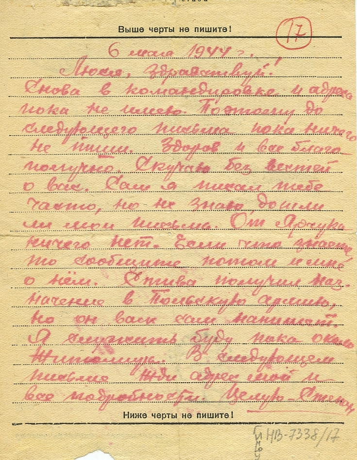 Снова в командировке и адреса пока не имею. Поэтому до следующего письма пока ничего не пиши. Здоров и всё благополучно. Скучно без вестей о вас. Сам я писал тебе часто, но не знаю, дошли ли мои письма. От Ярчука ничего нет. Если что знаете, то сообщите потом и мне о нём. Стива получил назначение в Польскую армию, но он вам сам напишет. Я служить пока буду около Житомира. В следующем письме жди адрес мой и все подробности. Целую. Степан.