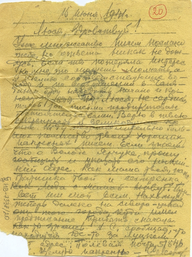 Пребольшая скука от того, что я с февраля месяца не знаю ничего о судьбе родных. Много передумал о нашей дружбе и о будущем. В более спокойной обстановке я расскажу тебе об этом. А пока желаю здоровья и счастья.