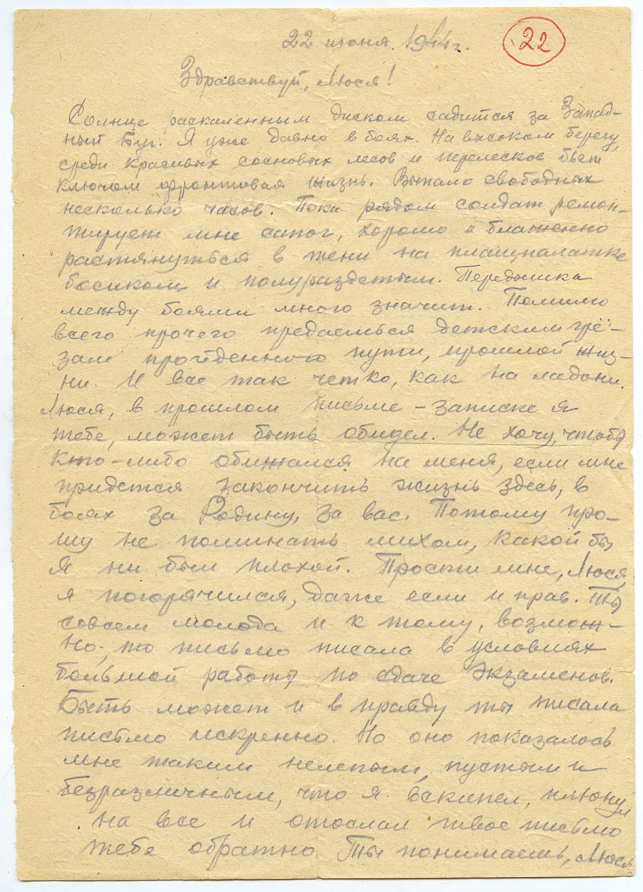 Люся, в прошлом письме-записке, я тебя, может быть, обидел. Не хочу, чтобы кто либо обижался на меня, если мне придется закончить жизнь здесь, в боях за Родину, за вас. Поэтому прошу не поминать лихом, какой бы я не был плохой. Прости мне, Люся, я погорячился, даже если и прав. Ты совсем молода и к тому, возможно, то письмо писала в условиях большой работы по сдаче экзаменов. Быть может и вправду ты писала письмо искренно. Но оно показалось мне таким нелепым, пустым и безразличным, что я вскипел, плюнул на всё и отослал твоё письмо тебе обратно. Ты понимаешь, Люся, с каким нетерпением я ждал от тебя письмо, первое письмо за 4,5 месяца после нашей прощальной встречи. Я часто вынимаю твой локон волос, твоё фото и всегда мои лучшие чувства и мысли с тобой. Обо всём я писал тебе откровенно. У меня нет более близкой подруги, чем ты. Я не склонен вовсе к донжуанству. Мне не хочется забыть тебя. Но ты написала такое письмо, что можно лишь пожалеть о прошлом. Может быть всё это напрасно я говорю. Хочу одно из двух, либо подробного объяснения, либо суровой правды. У тебя должно быть мужество и чистая совесть девушки разрубить этот узел. Давно и сколько раз я прошу тебя сказать ясно: Да или Нет. Но ты либо писала, что вопрос наших дальнейших отношений не будешь разбирать в письмах, а только при встрече, либо вовсе молчишь.