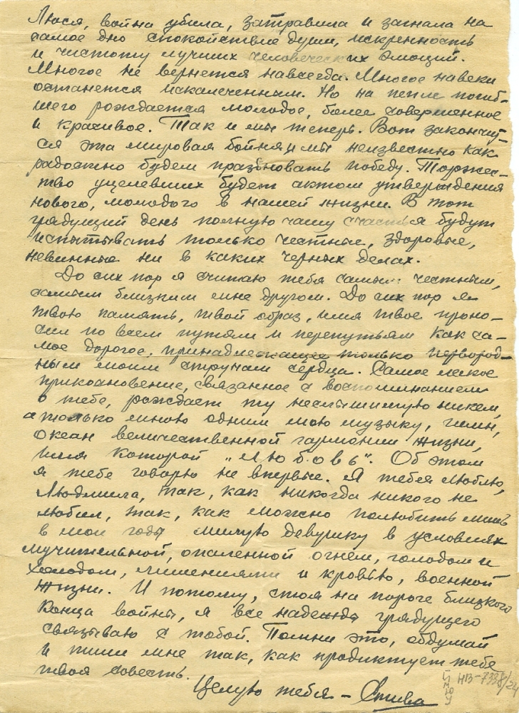 До сих пор я считаю тебя самым честным, самым близким мне другом. До сих пор я твою память, твой образ, имя твоё проносил по всем путям и перепутьям как самое дорогое, принадлежащее только первородным моим струнам сердца. Самое легкое прикосновение, связанное с воспоминанием о тебе, рождает ту неслышимую никем, а только мною одним, мою музыку, гимн, океан величественной гармонии жизни, имя которой «любовь». Об этом я тебе говорю не впервые. Я тебя люблю, Людмила, так, как никогда никого не любил, так, как можно полюбить лишь в мои годы милую девушку в условиях мучительной, опаленной огнем, голодом и холодом, лишениями и кровью, военной жизни. И потому, стоя на пороге близкого конца войны, я все надежды грядущего связываю с тобой. Помни это, обдумай и пиши мне так, как продиктует тебе твоя совесть.