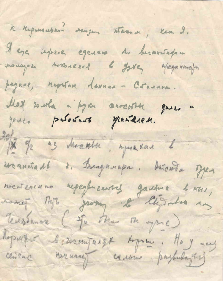 Конечно, это сообщение Вас не обрадует, но учтите, что страна примет все меры в нормальной жизни таким, как Я. Я еще лучше сделаю по воспитанию молодого поколения в духе преданности родине, партии Ленина – Сталина. Моя голова и руки способны долго и долго работать учителем.