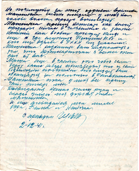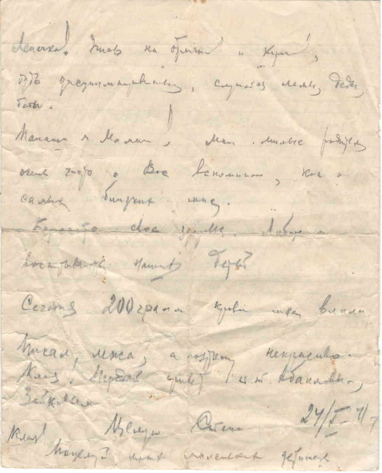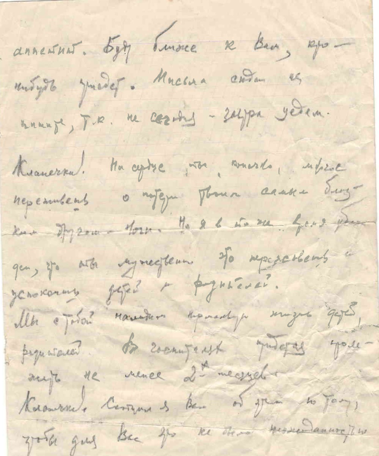 Берегите свое здоровье. Любите и воспитываете наших детей. Сегодня 200 грамм крови мне влили. Писал, лежа, и поэтому некрасиво. Кланя! Передай привет (…). Кланя! Поцелуй наших маленьких детей.