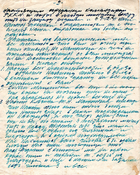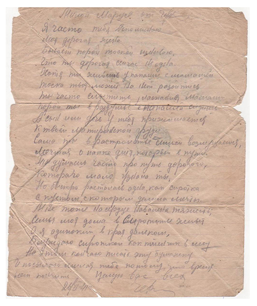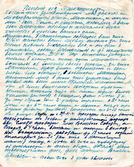 Машинька, в настоящем сообщаю вам что 25/XI 41 получил ваше первое письмо за что чисто сердечно благадарю вас, и то уже я Машинька, совсем растроился и до получения вашего письма, 25-11-41 еще отправил заказное письмо, в котором чуть-чуть Машинька не выругался от волнения своего сердца, за что Машинька перед вами извиняюсь и свои слова беру обратно, вовторых Машинька простите меня в том что задержал ваш визит при всем моем Желании Машинька ни как не смог выкроить свободный кусочек времени, потому что на этой неделе велись усиленные занятия с бойцами, днем и ночью т.к. за эту неделю были 2 учебных тревоги с 2х часов ночи и до 6и часов утра, а потом опять проводили дневные занятия каждый по 6-10 часов на улице. Вчера т.е. с 29-11-41 проходил смотр нашей подготовки по боевой и политической подготовке, смотр проводил Член Военного Совета, и сегодня в 4 часа, встали и пошли в колхоз на воскресник работали до 13 часов ходили километров за 20 так что в настоящий момент спину, и ноги не чего не чувствуют от усталости и после обеда начался наш торжественый день, день приема Военной присяги и после чего я уже являюсь настоящим преданным командиром Р.К.К.А. и готов в любую минуту выступить на защиту родины и с 3-12-41 ночи начинаются прыжки с парашютом т.е. последняя наша отработка по боевой подготовке.