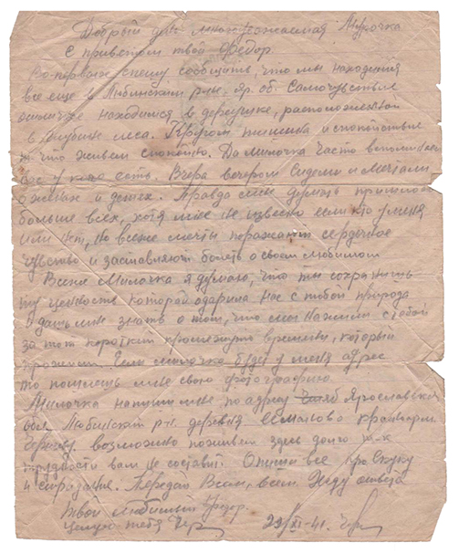 Во первых спешу сообщить, что мы находимся все еще в Любинском р-не Яр.об. Самочувствие отличное. Находимся в деревушке, расположенной в глубине леса. Кругом тишина и спокойствие т. что живем спокойно. Да милочка часто вспоминаю вас у кого есть. Вчера вечером сидели и мечтали о женах и детях. Правда мне думать пришлось больше всех, хотя мне не извесно если кто у меня или нет, но все же мечты поражают сердечное чувство и заставляют болеть о своем любимом.