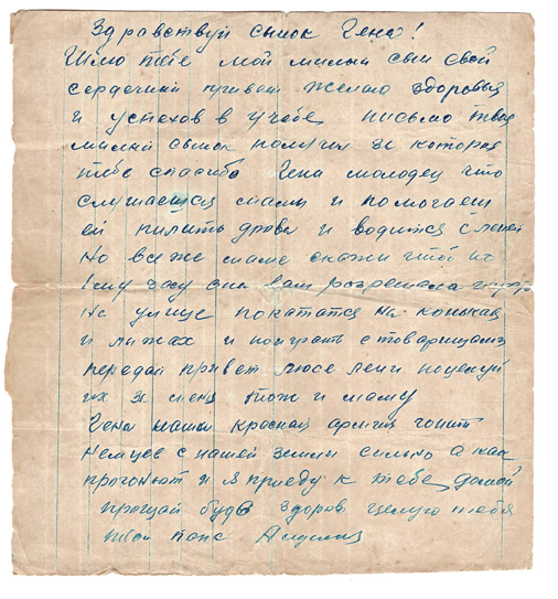 Шлю тебе мой милый сын сердечный привет. Желаю здоровья и успехов в учебе. Письмо твое милый сынок получил за которое тебе спасибо. Гена молодец, что слушаешься мамы и помогаеш ей пилить дрова и водится с Леней. Но все же маме скажи чтоб по 1му часу она вам разрешала играть на улице покататься на коньках и лыжах и поиграть с товарищами. Передай привет Люсе Лени поцелуй их за меня тож и маму.