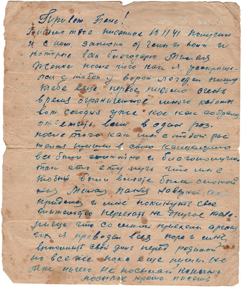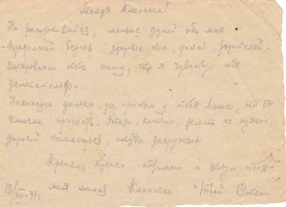 Письмо твое, писанное 18.11.41, получил и с ним записки от Гены и Юли, за которые всех благодарю. Милая жёнка, после того как я распрощался с тобой у ворот лагеря, пишу тебе еще первое письмо, очень время ограниченное, много работы. Вот сегодня уже кое как собрался ответить всем в один раз.