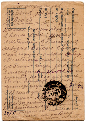 Машинька прошу написать как насчет продуктов сейчас в Челябинске а также найти как вообще проходит жизнь и еще где служит Пичугин Н.В. и кого еще взяли в РККА из знакомых.