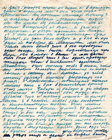 4. Машинька вы просили написать почему я не позвонил с вокзала, Машинька познее как вы ушли из райвоенкомата нас ни стали выпускать не куда, а там нет телефона и когда пришли на вокзал, то я при первой-же возможности стал звонить, но уже было позно и у вас не кто даже не ответил, да Машинька мне очень жалко того время что я его проводил один тогда, как была возможность провести его вместе с вами и мне даже очень было обидно что я был один и проводил последние часы в Челябинске одинокий.