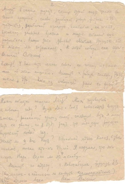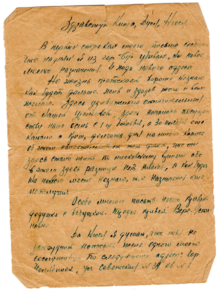Да Нюся я думаю, что тебя не затруднит написать жене одного моего сослуживца по следующему адресу: Гор. Челябинск, ул. Советская № 34 кв. № 1 Дмитриенко Зинаиде Николаевне, что ее муж находится сомной, ты это должна делать каждый раз как от меня получишь письмо в котором будут известия от ее мужа – Дмитриенко, об этом мы условились с ним что он будет писать променя своей жене, а я тебе, а вы будете сообщать одна другой. Только нетеряй ее адреса ибо я больше его сообщать не буду.
