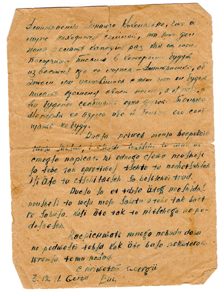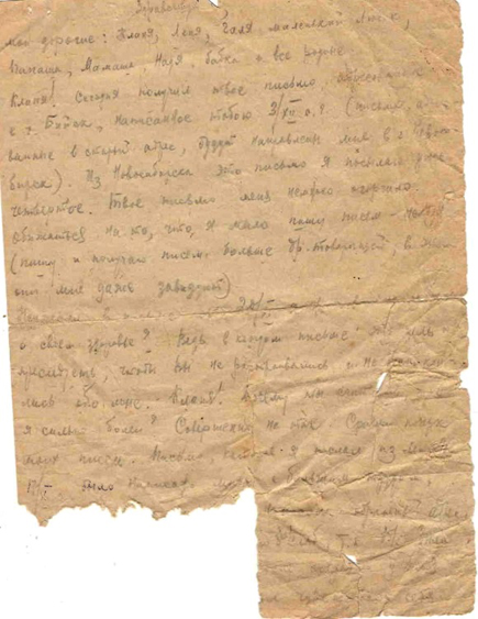 Кляня! сегодня получил твое письмо, адресованное в г. Бийск, написанное тобою 3/XII с.г (письма адресованные в старый адрес, будут направлены мне в г. Новосибирск). Из Новосибирска это письмо Я посылаю уже четвертое. Твое письмо меня немножко огорчило. Обижаться на то, что я мало пишу писем – нельзя ( пишу и получаю писем больше др. товарищей, в этом они мне даже завидуют).