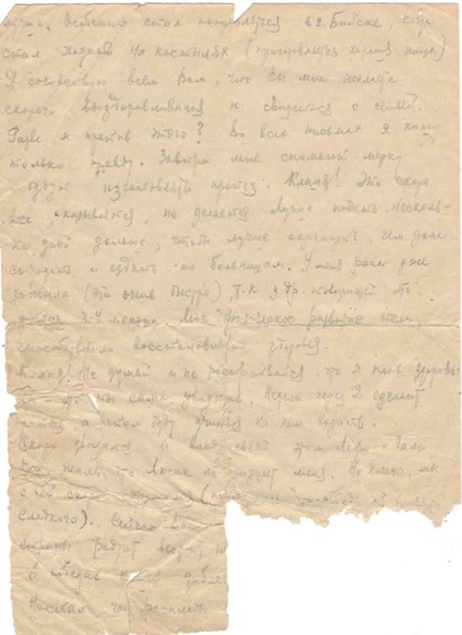 Кланя! Не думай и не расстраивайся, что я плох здоровьем – это ты сама увидишь. Недели через 2 сделают протез, а потом буду учиться не нем ходить. Скоро увидимся и воодушебляй этим Леню и Галю. Как жаль, что Люсик не признает меня. Но ничего, мы с ней скоро сдружимся (постараюсь что – нибудь ей привезти сладкого). Сейчас Вас (…) страны радует вести о победах нашей доблестной (…). Настал час расплаты.
