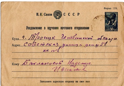 Получатель – Надежда Ивановна Бакланова