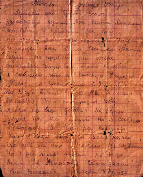 здравствуй дорогая Моя сестра Анастасия Матвеевна и а племянники Зоя, Коля посылаю мой красноармейский привет и передай всем моим сестрам Анюте Шуре по привету от меня