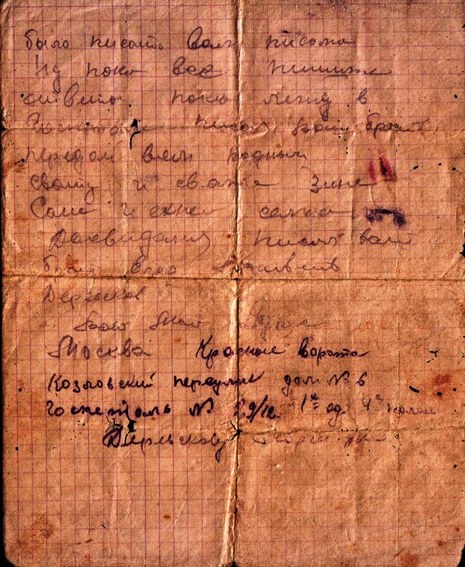 Милочка напиши мне по адресу Ярославская обл. Любинский р-н. деревня Есманово красноармейцу Черняеву возможно поживем здесь долго т-к трудности вам не составит. Опиши все про скуку и страдание. Передай Всем, всем. Жду ответа.