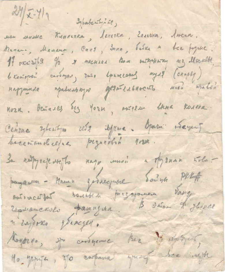 мой милые Кланечка, Леночка, Галочка, Люсик, Папаша, Мамаша, Саня, Зина, бабка и все родные. 17 октября с\г я посылал Вам открытку из Москвы, в которой сообщал, что вражеская пуля (справа) нарушила правильную деятельность моей правой ноги. Остался без ноги, отняли выше колена. Сейчас чувствую себя лучше. Врач сообщил восстановление резиновой ноги. За надругательство надо мной и (…) товарищами – Наши доблестные бойцы РККА отомсти полным разгромом бонд германского фашизма. В этом я уверен и глубоко убежден.