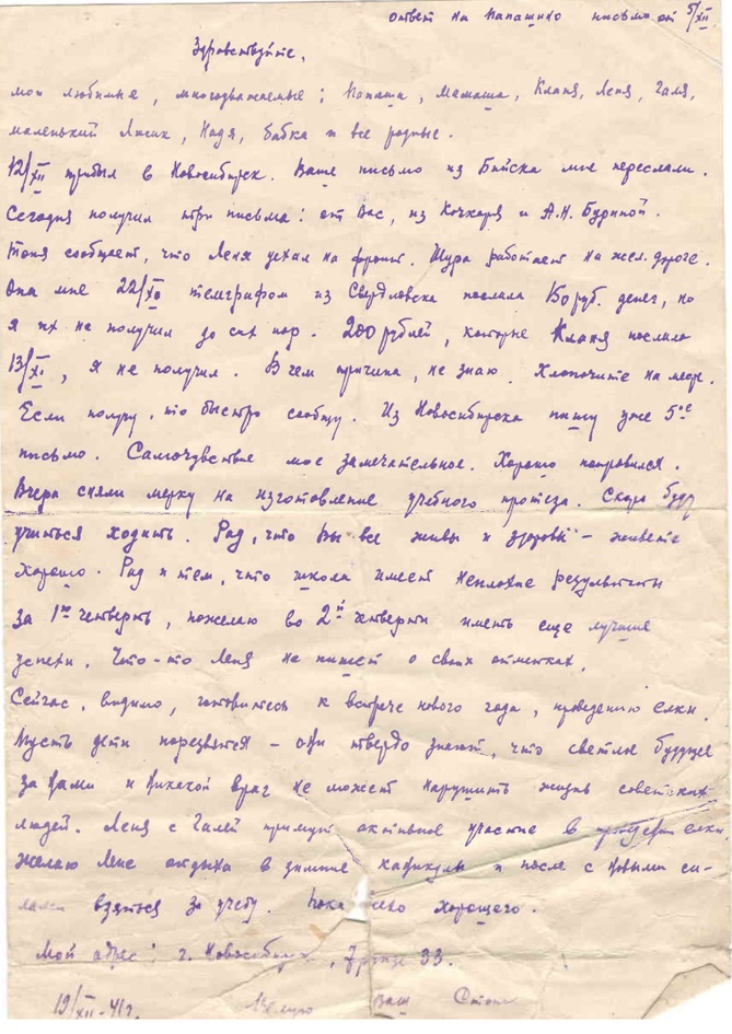 12\XII прибыл в Новосибирск. Ваше письмо из Бийска мне переслали. Сегодня получил три письма: от Вас, из Качкаря и А.Н. Буриной. Тоня сообщает, что Леня уехал на фронт. Шура работает на жел. дороге. Она мне 22/XI телеграфом из Свердловска писала 150 руб. долг, но я их не получил до сих пор. 200 рублей, которые Кланя послала 13\XI, я не получил. В чем причина, не знаю. Хлопочите на месте. Если получу, быстро сообщу. Из Новосибирска пишу уже 5 – ое письмо. Самочувствие мое замечательное. Хорошо поправился. Вчера сняли мерку на изготовление учебного протеза. Скоро буду учиться ходить. Рад, что Вы все живы и здоровы – живите хорошо. Рад и тем, что школа имеет неплохие результаты за 1- ю четверть, пожелаю во 2 – й четверти иметь еще лучше успехи. Что – то Леня не пишет о своих отметках.