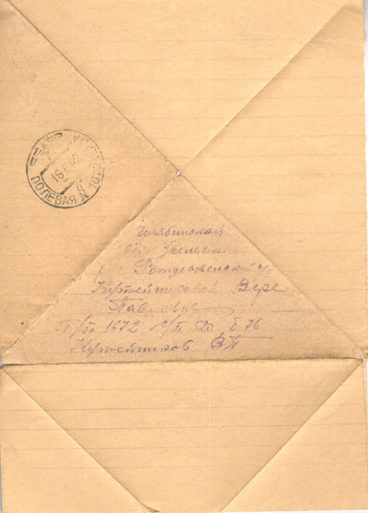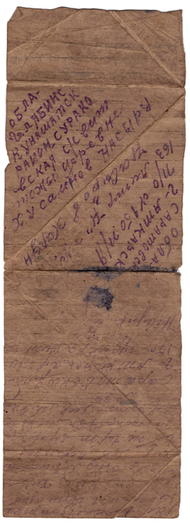 Напишите от меня куму Николаю Тырину. Привет и если то пошлите мой адрес ему а мне пришлите его адрес если ест то Алеши Гусева адрес. Но я пока письмо свое хочу закончить. Мой адрес у вас ест пишите поэтому. Я там вам послал денег немного как получите напишите вам они годятся хоть за козу пастушные заплатите. А пока крепко целую вас всех и досвидания. Пропишите где усадили картошку. А у меня здес горох привзошол. Я там в одном письме нарисовал картинку это наша избушка такая.