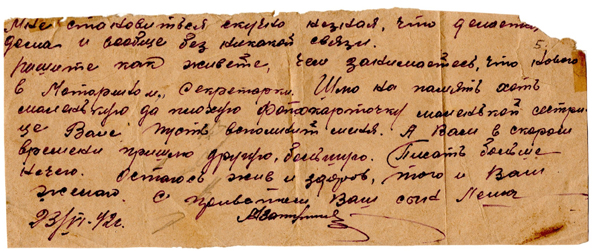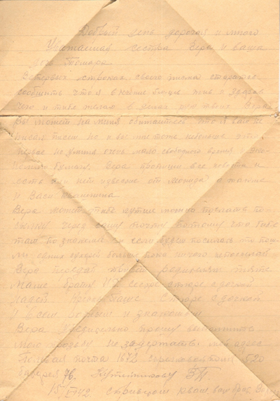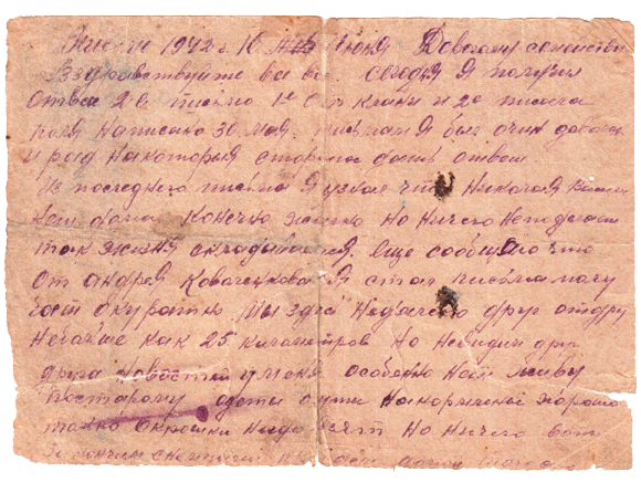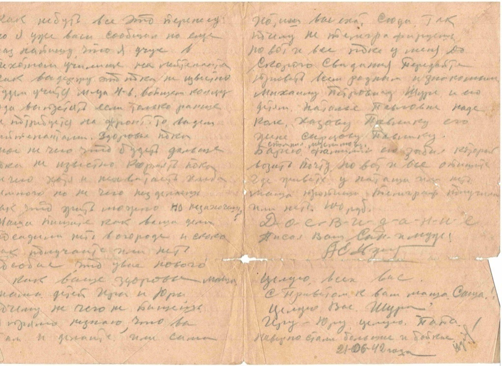 Добрый день здравствуйте моя дорогая и любимая жена Машинька и милые мои дети Юра, Дима и Нина посылаю я вам свой често сердечный привет и всего наилучшего здоровья и успехов в вашей жизни. Машинька настоящим сообщаю вам о том, что вчера получил ваше письмо которое еще вами было писано 19-03-42 по прошлому моему адресу т.е. через 3-и месяца за что конечно я вам благодарен и я его перечитал несколько раз потому что нового от вас уже месяц не чего не получал не знаю начто Вы огневались и позабыли меня, не пишите не чего