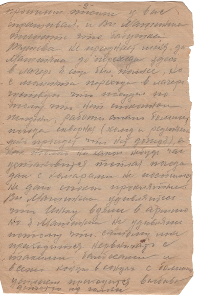 На етом я кончаю своё письмо не обижайся что плохо написал, писал в тайге кусают комары итак даже голова шумит спать хочится неспал путём уже суток четверо.