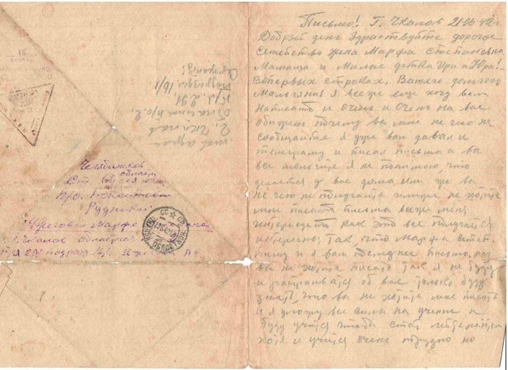 Маша пишите как ваши дела? Посадили или нет в огороде и скоко. Как получаете или нет. Сообщите что увас нового, как ваше здоровье Маша, как наши дети Ира и Юра. Почему не чего не пишешь прямо незнаю, что вы там делаете или сама хотиш выехать сюда так почему не телеграфируете но вот и все пока у меня. До Скорого Свидания. Передайте приветы всем родным и знакомым Михаилу Петровичу, Шуре и его детям. Наталье Павловне, Наде, Коле Хазову Павлику его жене Сирцову Павлику.