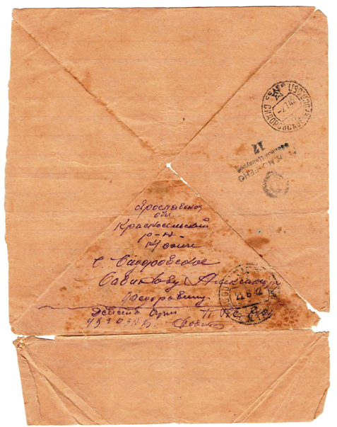 Дорогому семейству. Здравствуйте все все. Сегодня я получил от вас 2-е письмо 1-е от Клани и 2-е писала Поля. Написано 30 мая. Письмам я был очин доволен и рад на которыястараюс дать ответ. Из последнего письма я узнал что Николая Васильевича нет дома. Конечно жалко но ничего не поделаешь так жизня складывается. Еще сообщаю что от Андрея Коваленкова стал письма получат окуратно. Мы здесь недалеко друг от друга небольше как 25 километров но невидим друг друга. Новостей у меня особенно нет живу постарому одеты обуты накормлены хорошо только окрошки ниделают. Но ничего вот закончим с немцем придем домой тогда все наквитаем. А пока примите отменя поклон и передавайте всем родным и знакомым от меня поклон. Пишите письма особенно нескучайте и не беспокойтесзаменя. Передайте поклон Поли с детками и КланиТыриной с детками.