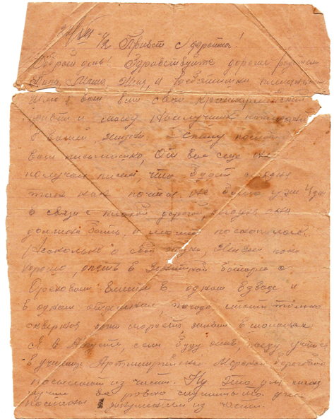 Добрый день! Здравствуйте дорогие родители Папа, Мама, Женя и ребятишки племянники. Шлю я вам всем свой красноармейский привет и массу наилучших пожеланий в вашей жизни. Спешу послать вам письмишко, от вас еще не получил письма, что будет сегодня так как почты не было уже 4 дня в связи с плохой дорогой, сегодня она должна быть, и может поскопилось. Несколько о своей жизни, живем пока хорошо, опять в (…) с Ореховым в одном взводе и в одном отделении, погода стоит только скверная (…) живем в шалашах. Я в августе если буду жив, поеду учиться в училище Артиллерийское Морской береговой посыльный из части. Ну это уж (…) лучше все равно служить. Уже послал документы из части.