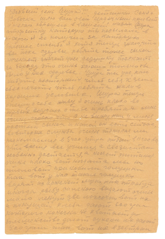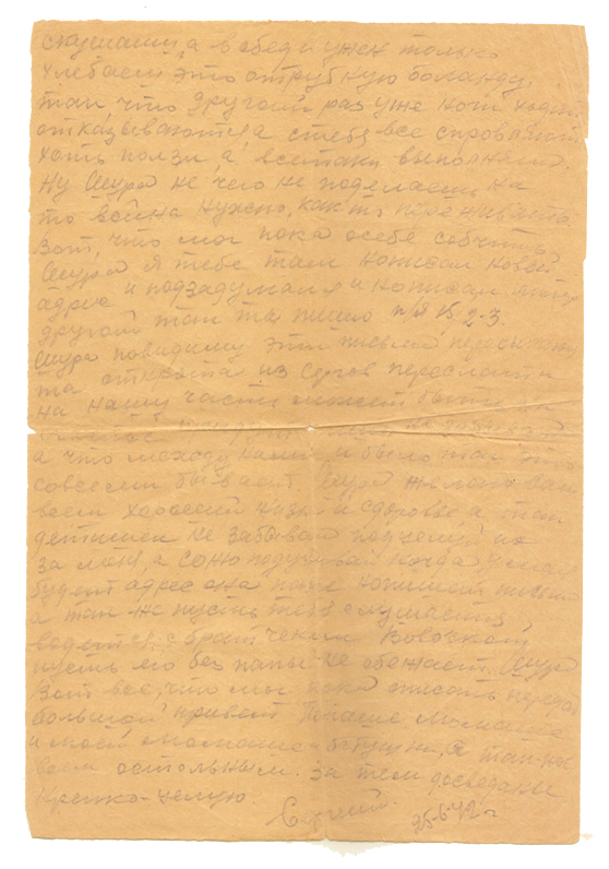 Добрый день Шура!!! Детишки Соня и Вовочка шлю вам свой сердечный привет и желаю хорошего в вашей жизни. Шура открытку которую ты посылала в Н-Серги я ее получил за которую большое спасибо. Я хотя теперь знаю, что вы пока сдоровы ребята тоже. Сынок начинает значит уже дедушку таскать за бороду это очень хорошо только бы было у них сдоровье. Шура ты уж, как нибудь постарайся, чтобы себя к земе обеспечить, чтоб ребята жили в хороших условиях. Шура теперь опешу о себе живу я очень плохо во первых скучаю о тебе и ребятах мне очень горько, что я не вижу как у меня растет сынок и какой он есть сейчас, во вторых служба очень тяжолая мы поднимаемся в 5 час. Утра отбой в 11 час. вечера. Это время все учимся, а связистам особенно дастается, а носчет питания очень плохо вот когдата мы из столовой приносили голушки так вот у нас такие голушки варят из арженой муки, как отрабу, а иногда рыбу саленною выдают очень мало пекут две ложочки вот их покушай хлеба дают 600 грам котрого конечно не хватает, а большенство дают сухари их дают 400 грам так вот их в завтрак скушаешь, а в обед и ужин только хлебаеш это отрубную боланду так, что другой раз уже ноги ходить отказываются, а стебя все справляют хоть ползи, а всетаки выполняеш. Ну Шура не чего не поделаешь на то война нужно, как то переживать. Вот, что мог пока о себе собчить, Шура я тебе там написал новый адрес и подзадумался и написал (…) другой так ты пиши п/я 15/2-3. Шура повидиму эти письмо пересылают та открытка из Сергов пересылают на нашу часть может быть на счастье придут пиши не забывай, а что между нами и было так это совсеми бывает. Шура желаю вам всем хорошей жизни и сдоровье, а так детишек незабываю поцелуй их за меня, а Соню подучивай когда у меня будет адрес она тоже напишет письмо а так же пусть тебя слушается, водиться с братиком Вовочкой пусть его без папы не обижает. Шура вот все, что мог пока написать передаю большой привет Папаше Мамаше и моей мамаше и бабушке, а так же всем остальным. За тем досведание крепко целую Сергей.