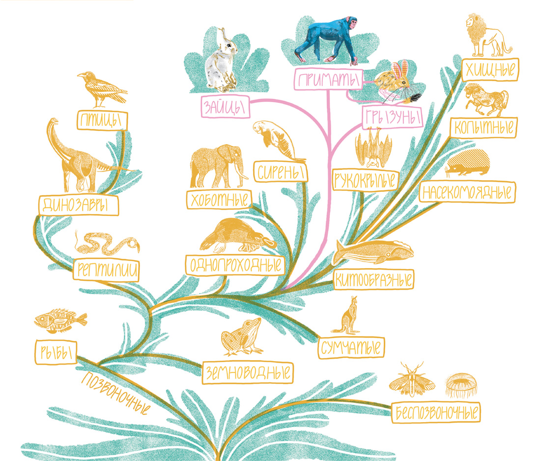 Учёные составляют такие же деревья для целых видов животных, как современных, так и вымерших. Чем ближе виды друг к другу на таком дереве, тем они более родственны. Предковые формы будут встречаться в основании деревьев, а потомки – ближе к кончикам ветвей.