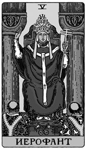 В храме между колоннами восседает Иерофант. Его голову венчает тройная тиара, правая рука воздета в благословляющем жесте, а в левой тройной крест. У его ног преклонили колени два монаха в стихарях. Иерофант означает «раскрывающий священное знание», в отличие от Верховной жрицы, которая говорила о тайном знании.