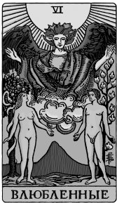 Перед нами сюжет из райского сада незадолго до падения. В лучах солнца ангел распростер руки, словно устраняясь от участия и соглашаясь с любым выбором, который будет сделан мужчиной и женщиной. За спиной Адама Древо жизни, а за спиной Евы Древо познания, и рядом уже вертится змей, которому не терпится преподнести людям первый урок и поселить в их душах семена зла. Это карта важного выбора, который предопределит дальнейшее развитие жизни. Это аркан любви как стремления к счастью благодаря союзу с другим человеком.