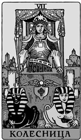 На триумфальной колеснице восседает воин в богатом облачении и с жезлом в правой руке. Стены города остались позади, и герой готов отправиться в путь, навстречу приключениям и подвигам. Колесница является образом человека. Так, согласно Платону, сама повозка – это тело, а возница – дух, управляющий двумя запряженными лошадьми, черной и белой. Белая лошадь красива и имеет благородный нрав, это наши благие добродетели; черная же косая, взлохмаченная, норовистая и зловредная, все время стремится утащить повозку с пути в канаву, и это наши неблаговидные черты и пороки, которые нужно усмирять и направлять обеих лошадей к высшей цели, которая ведома духу, и он должен руководить процессом.