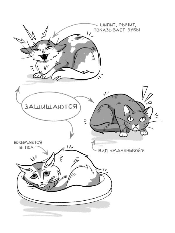 Когда кошка чего-то сильно боится, но не собирается нападать, она прижимается к полу, показывая, что она маленькая и безобидная. Если же опасность сохраняется, она начинает отпугивать ее шипением и рычанием. Если в такой момент кошке некуда убежать, она может начать кусаться и царапаться, чтобы спастись. Обычно кошки так себя ведут на приеме в ветеринарной клинике или когда знакомятся с другими животными. Положение ушей в таком случае отражает степень страха, который испытывает кошка: чем ей страшнее, тем сильнее ее уши разведены в стороны.
