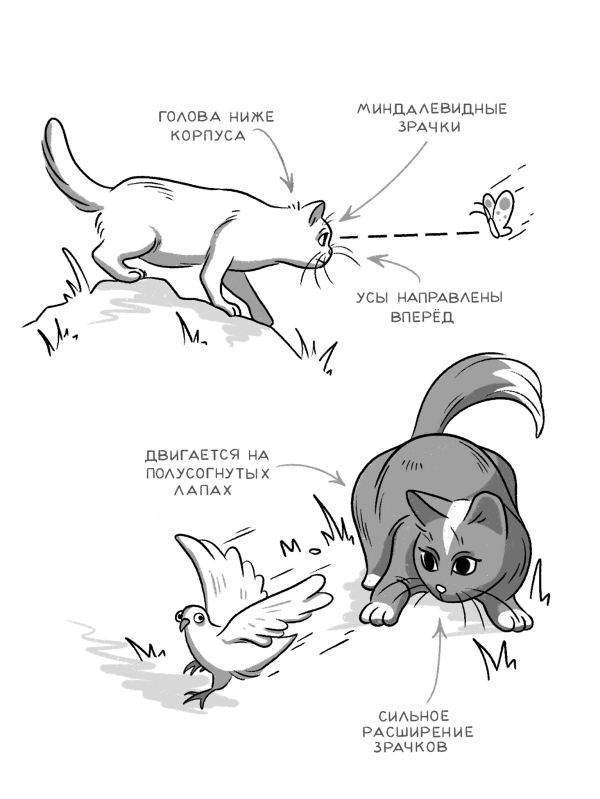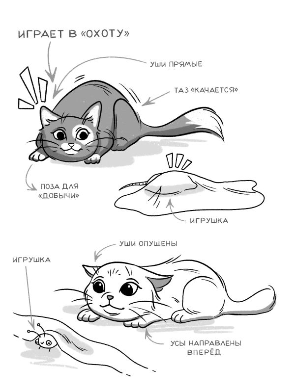 Когда кошка играет, ее поза может быть очень похожей на ту, что она принимает, когда ей страшно. Она прижимается к полу и прячет ушки, чтобы стать незаметнее для добычи. Понять, играет кошка или чего-то боится, можно не только по тому, есть ли рядом игрушка: когда кошка находится в игривом настроении, она немного сильнее прижимает голову к полу, направляет усы вперед и может покачивать тазом из стороны в сторону.