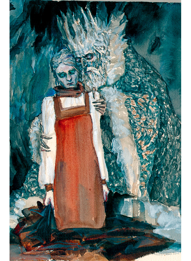 Скрывается Морозко в далекой чащобе. И не видно его, и не слышно его – спит он; а как настанет самая длинная ночь в году, так и просыпается, так за дело и берется: людей пугает, холода нагоняет, лес оберегает. Ходит Морозко только по снегу – в парчовой сверкающей шубе, мехами отороченной. Неспроста у него такая шуба, чтобы в сугробах не видно было. Борода у него длинная, поземкой метет, все следы заметает; шапка с каменьями, а в руках посох волшебный. Прыгает Морозко по деревьям, постукивает, устилает землю сугробами высокими, потрескивает; кто в лес зайдет неосторожно, тому холод под одежду задувает, до самых костей-косточек пробирает. Душу может заморозить, а как же человеку жить без души? Вот и не ходят в самые длинные и темные ноченьки зимние люди в лес, душу берегут; только прислушиваются – не трещит ли Морозко по крыше, не подбирается ли к огню в очаге, не готовится ли из озорства людей сгубить? Только зло и несправедливость могут Морозке дверь в избу открыть.