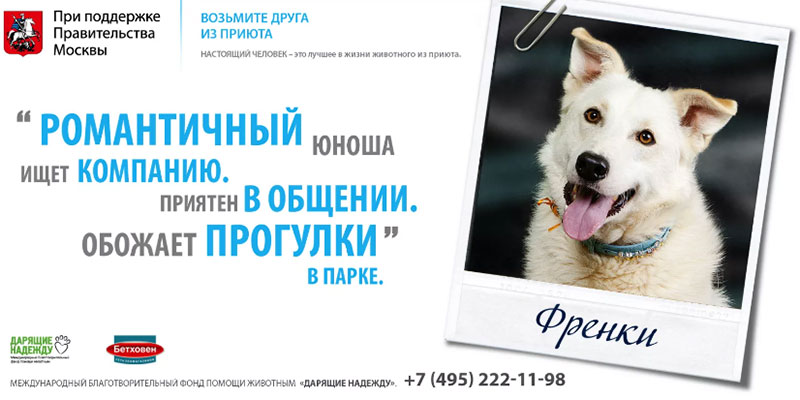 2. Подогрев интереса к новым продуктам и услугам. Реклама переходит из сферы продвижения продукта в сферу продвижения компании. Демонстрируя свою экспертность и ответственность через экологическую и социальную рекламу, бренды повышают свою ценность. Потребитель при этом получает информацию опосредованно и полагает, что раз компания устойчиво развивается и принимает социальную ответственность, то ее продукт отвечает всем современным требованиям качества. На рисунке видно, как бренд зоотоваров «Бетховен» демонстрирует заботу о бездомных животных. Та же компания поддерживает огонь в сердцах хозяев при помощи разных юмористических ходов: переводит инициативу с хозяина на питомца, наделяет питомца интеллектом и, конечно, юмором.